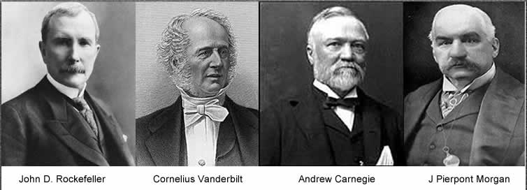 (上圖由左至右分別是19世紀(jì)末的美國“石油大王”約翰·洛克菲勒、“鐵路大王”康內(nèi)留斯·范德比爾特、“鋼鐵大王”